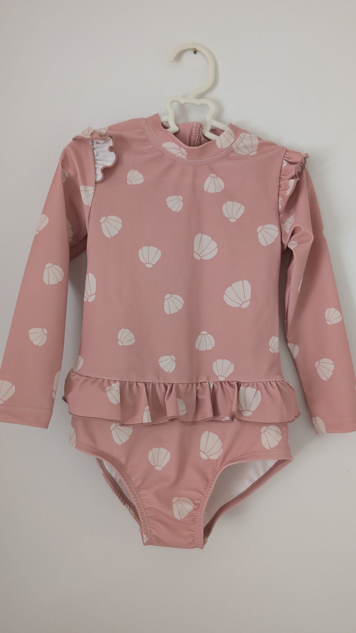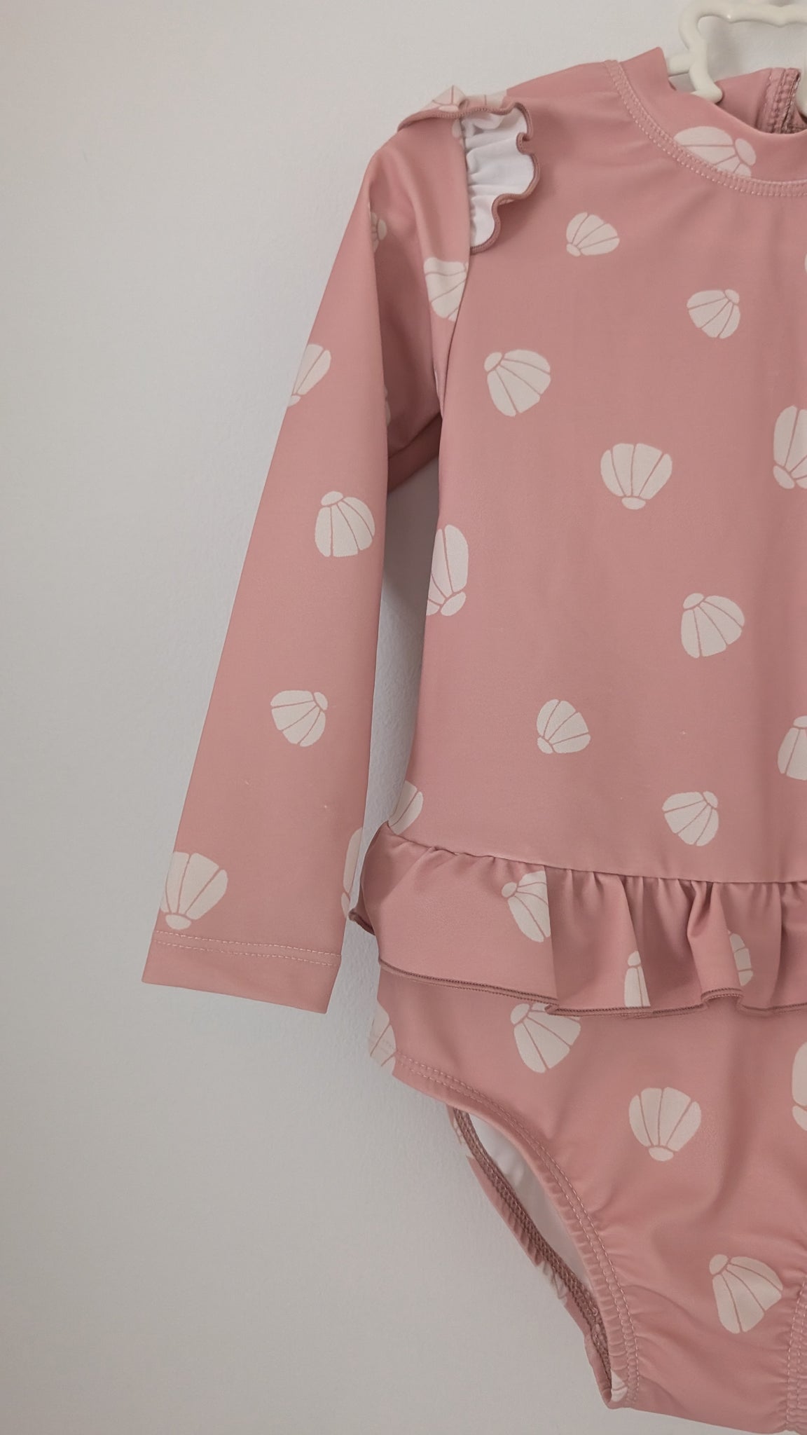 Sweetest swimsuit for your beach babes. Stunning baby pink and white striped design in gorgeous pastal tones. Tutu frill detailing at the leg. Ruffle detailing at the shoulders. Long sleeved for extra protection. Handy zip closure.